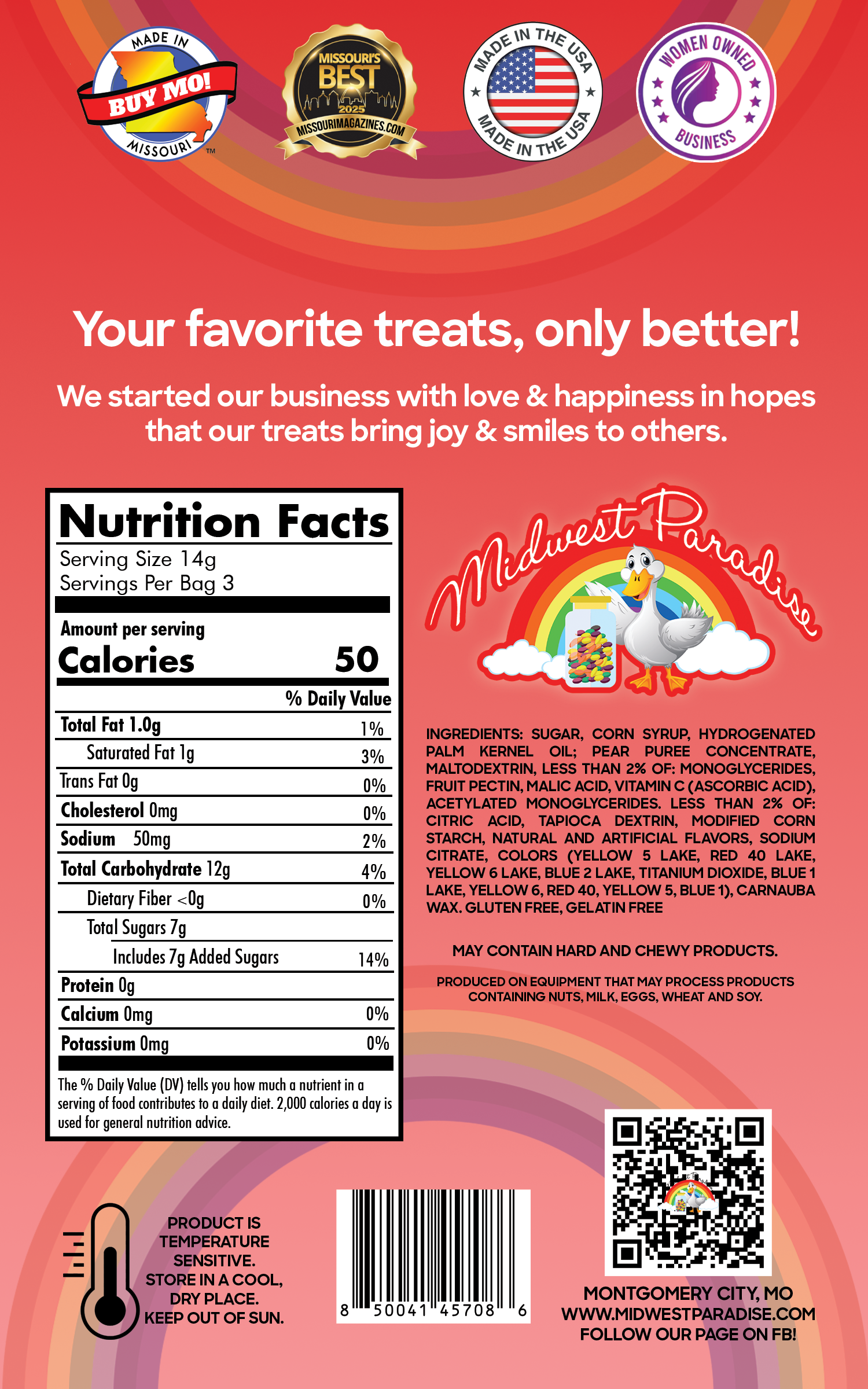 INGREDIENTS: SUGAR, CORN SYRUP, HYDROGENATED PALM KERNEL OIL, PEAR PUREE CONCENTRATE, MALTODEXTRIN, LESS THAN 2% OF: MONOGLYCERIDES, FRUIT PECTIN, MALIC ACID, VITAMIN C (ASCORBIC ACID), ACETYLATED MONOGLYCERIDES. LESS THAN 2% OF: CITRIC ACID, TAPIOCA DEXTRIN, MODIFIED CORN STARCH, NATURAL AND ARTIFICIAL FLAVORS, SODIUM CITRATE, COLORS (YELLOW 5 LAKE, RED 40 LAKE, YELLOW 6 LAKE, BLUE 2 LAKE, TITANIUM DIOXIDE, BLUE 1 LAKE, YELLOW 6, RED 40, YELLOW 5, BLUE 1), CARNAUBA WAX. GLUTEN FREE, GELATIN FREE